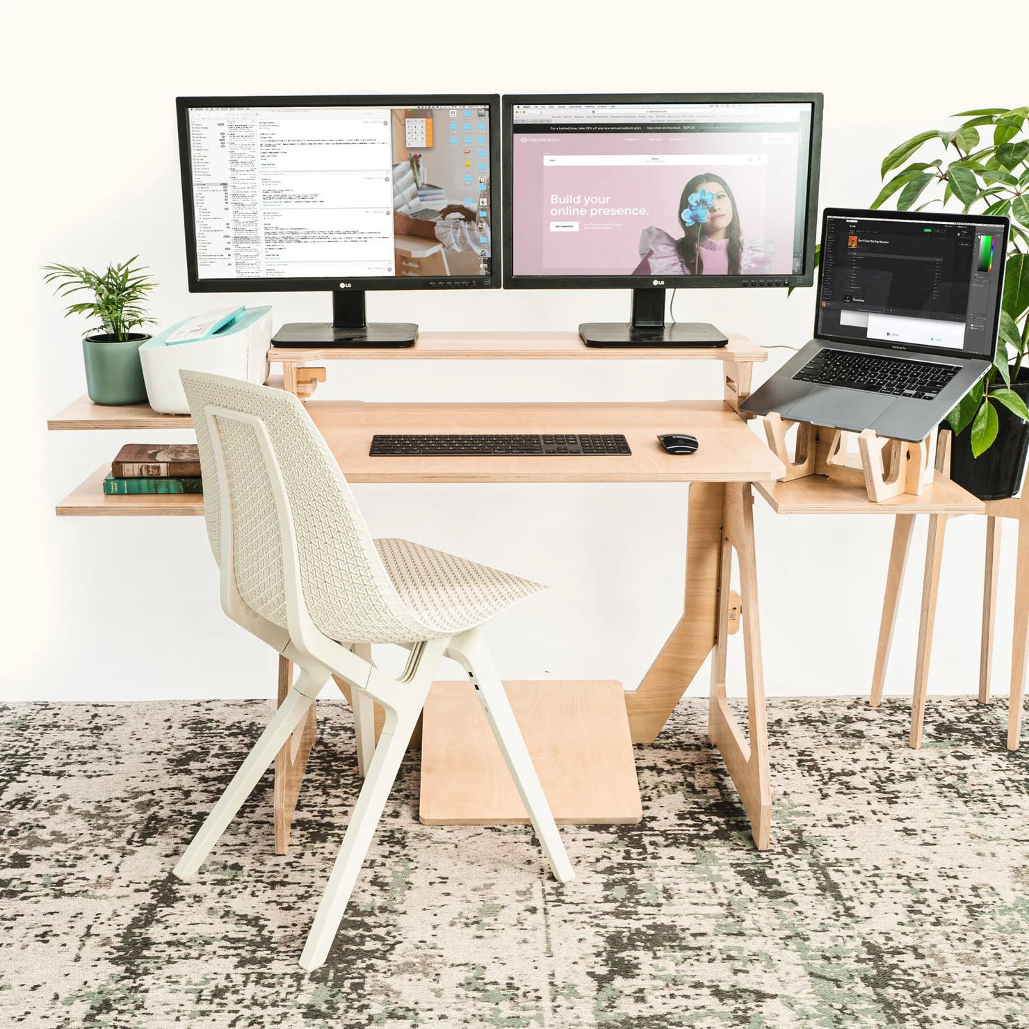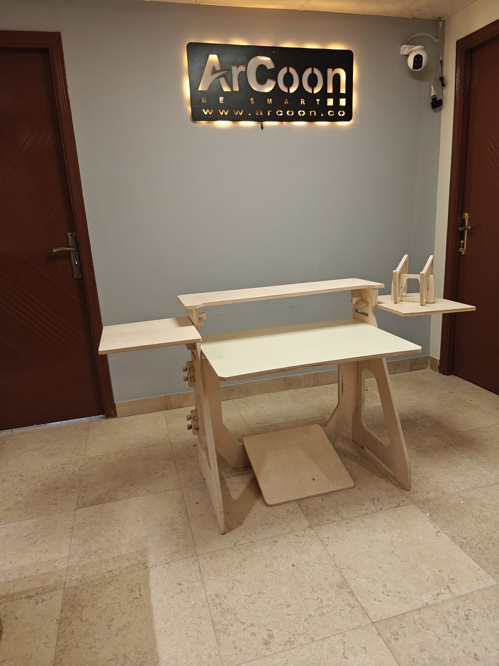 يحتوي المكتب على سطح واسع يسع شاشتين أو لابتوبين بسهولة، مع رف علوي لرفع الشاشة لمستوى العين للحفاظ على وضعية جلوس صحية ومريحة.