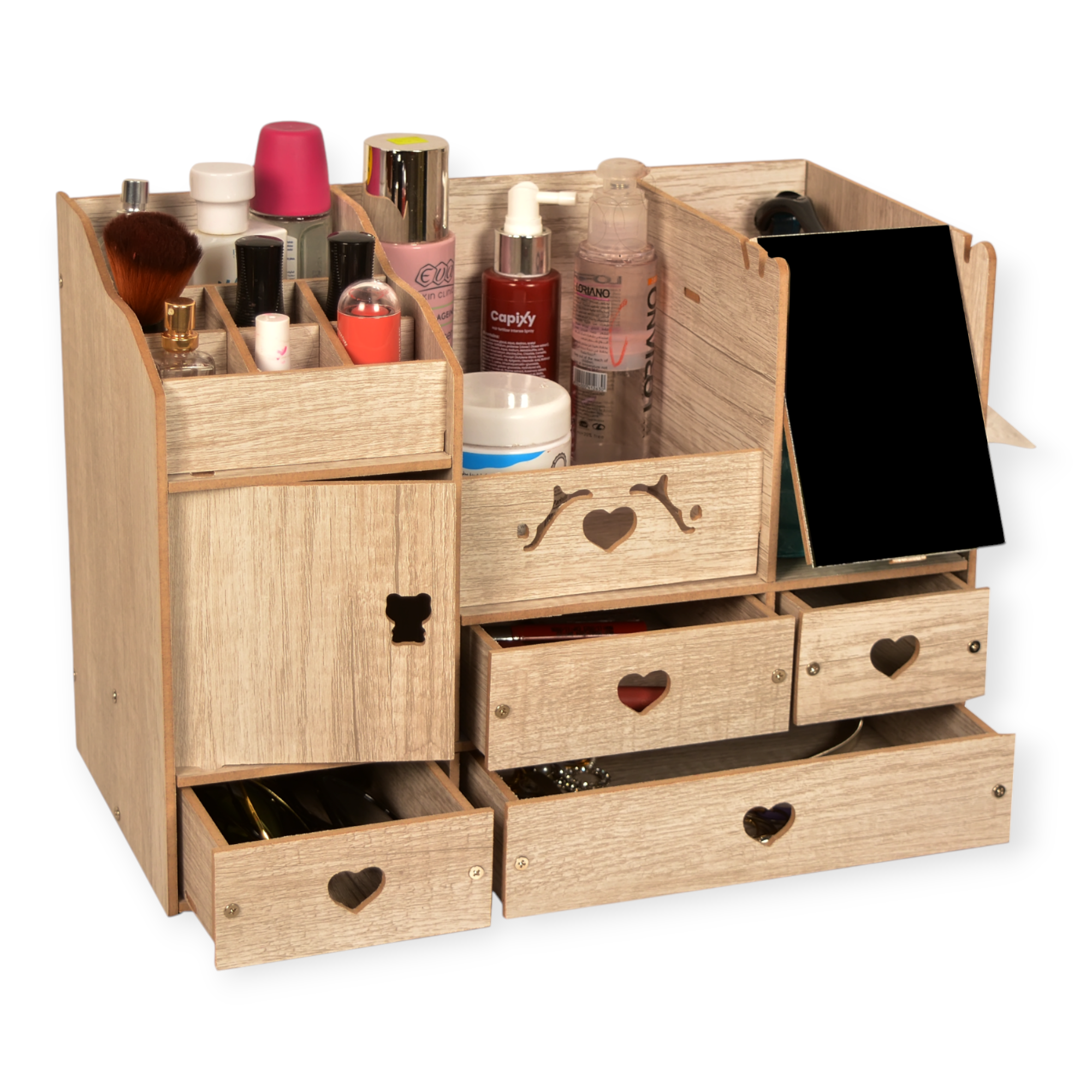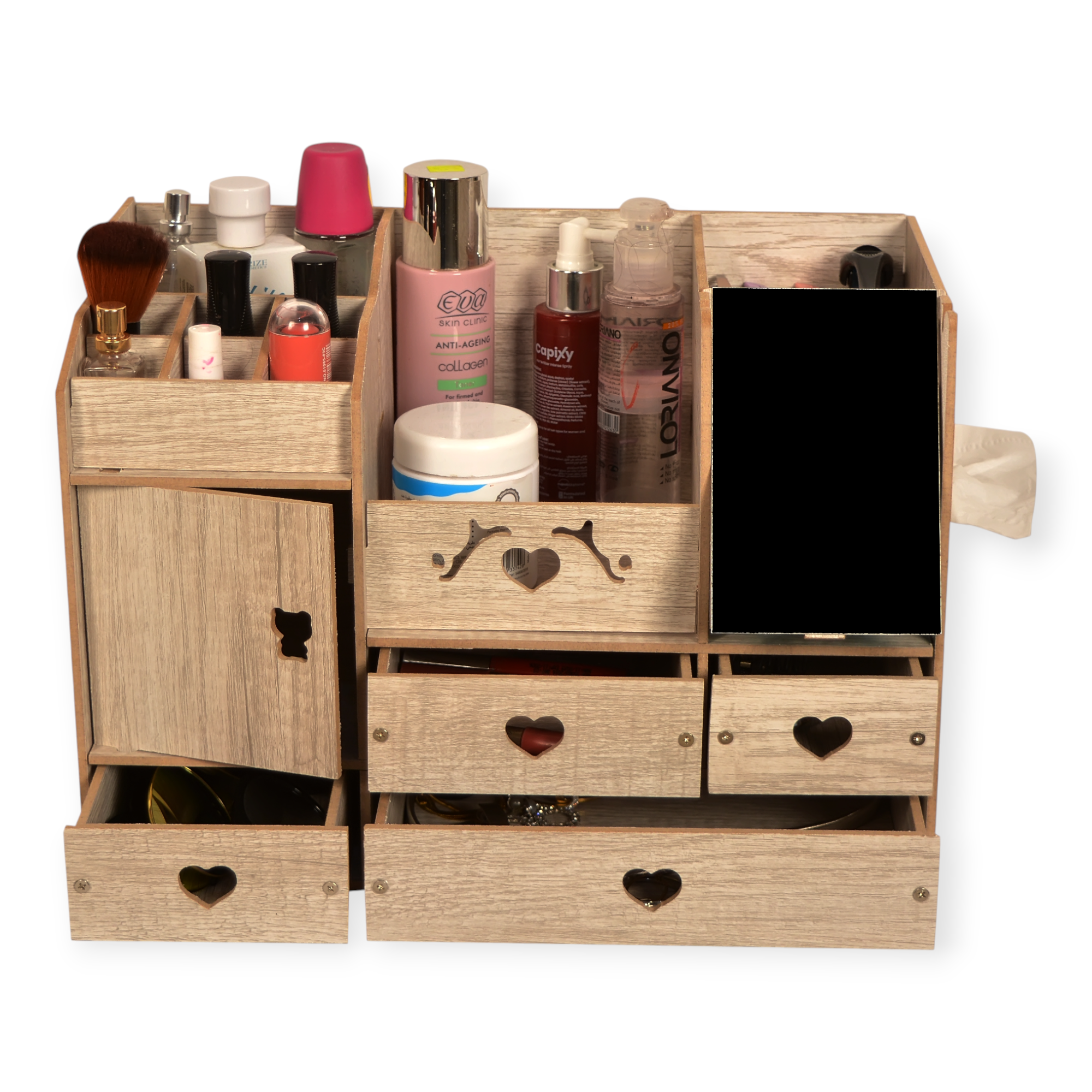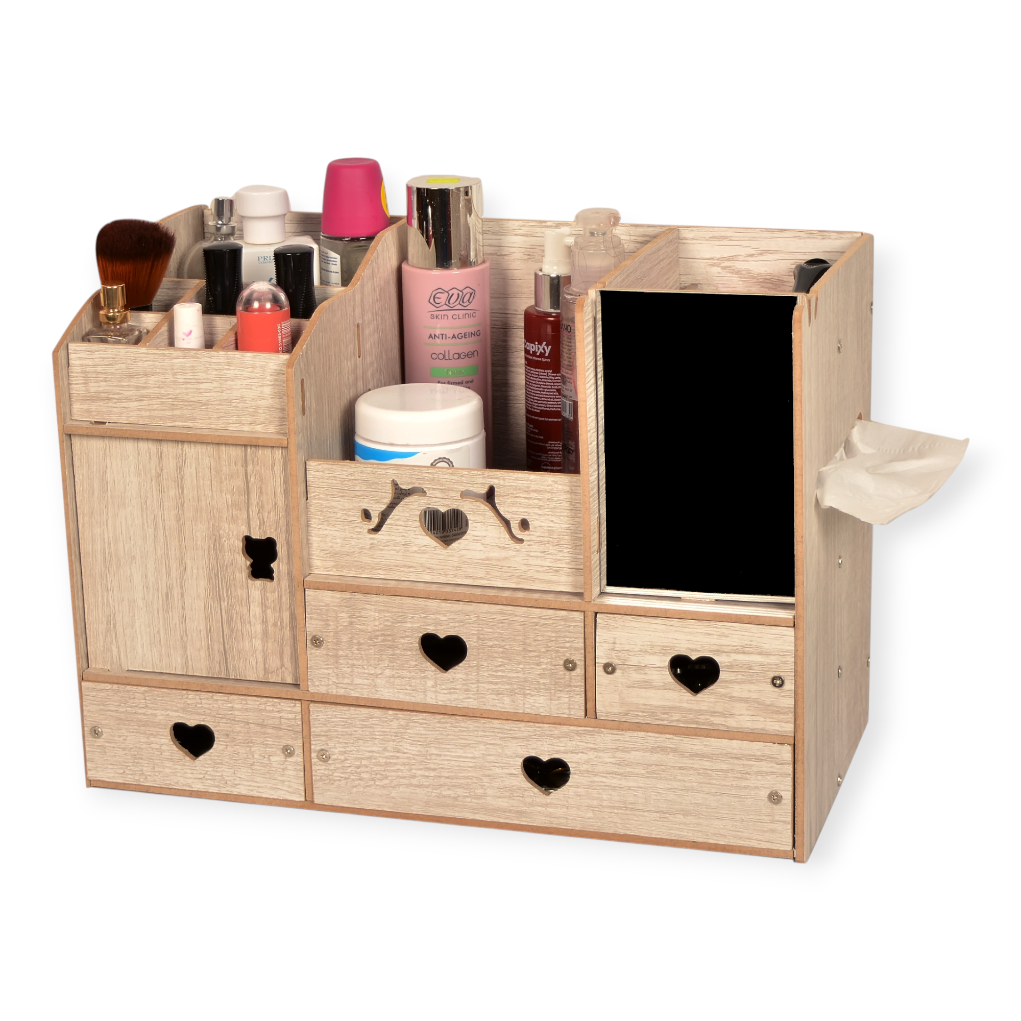 لسّه بتعاني من فوضى المكياج على التسريحة؟ منظم المكياج ده هو الحل المثالي! مصنوع من الخشب الصناعي عالي الجودة بلمسة وردية مطفية أنثوية، وبيضم 15 قسم تخزين من ضمنهم 4 أدراج بأحجام مختلفة، ورف مناديل مدمج، وكمان مرآة ميكب تشوفي فيها جمالك في أي وقت 💕